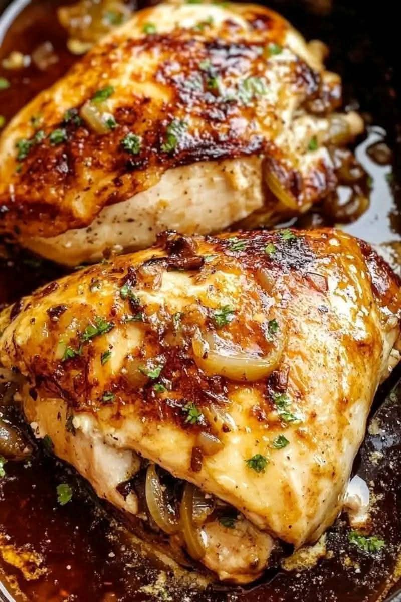 This French Onion Stuffed Chicken is a rich, savory twist on the classic French onion soup. Tender chicken breasts are filled with caramelized onions and melted Gruyère, seared to perfection, and baked in a flavorful broth for a dish that’s decadent yet comforting. Every bite delivers the irresistible sweetness of slow-cooked onions, creamy melted cheese, and juicy chicken.